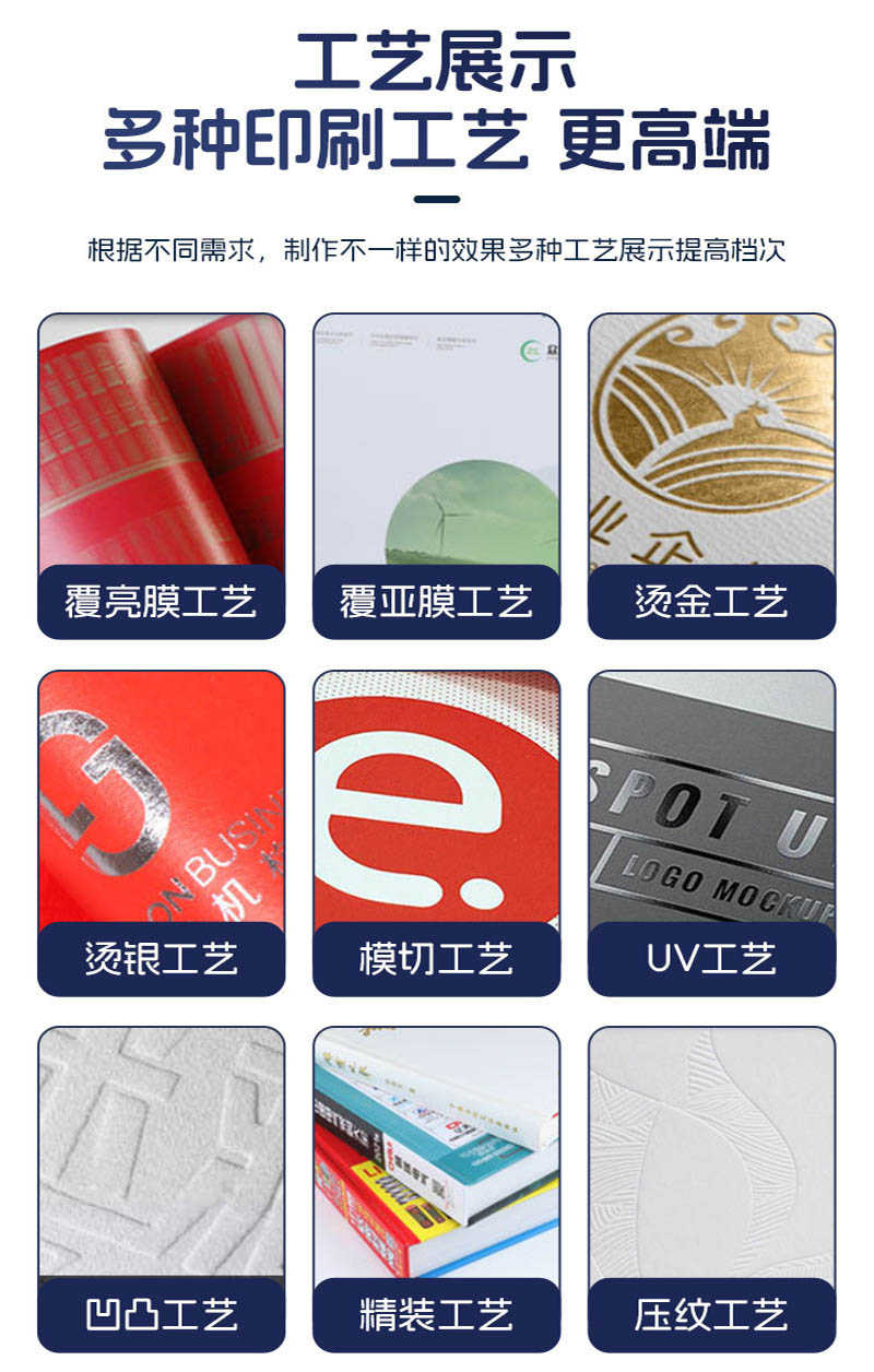 印刷纸张:铜版纸、双胶纸、哑粉纸、珠光纸、其他艺术纸(艺术纸种类较多我们可以免费提供纸样供您选择)