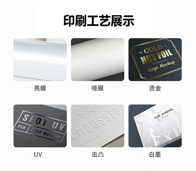常用工艺:覆膜(哑膜、光膜)、压纹、凹凸印、局部uv、烫银、烫金、印专色(PANTONE色)、镂空、镭射、打孔、叠印、丝网印、透印、过光油、哑油等
