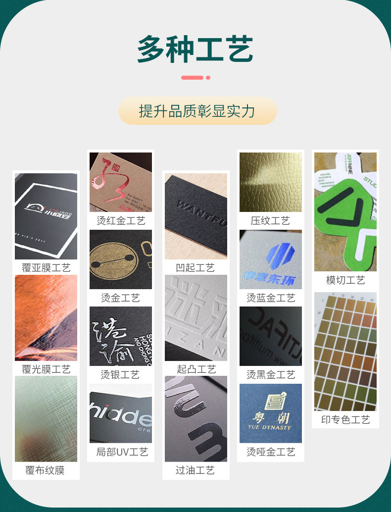 常用工艺:覆膜(哑膜、光膜)、压纹、凹凸印、局部uv、烫银、烫金、印专色(PANTONE色)、镂空、镭射、打孔、叠印、丝网印、透印、过光油、哑油等