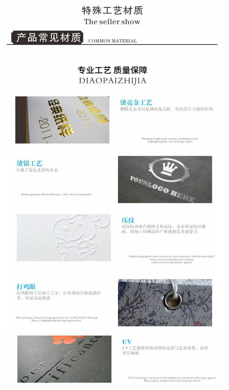 印刷纸张:铜版纸、双胶纸、哑粉纸、珠光纸、其他艺术纸(艺术纸种类较多我们可以免费提供纸样供您选择)