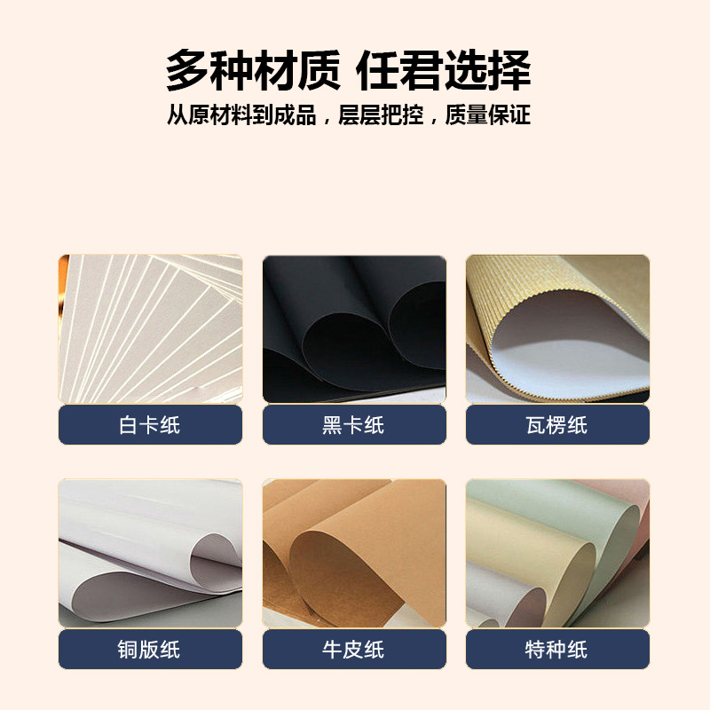 印刷纸张:铜版纸、双胶纸、哑粉纸、珠光纸、其他艺术纸(艺术纸种类较多我们可以免费提供纸样供您选择)